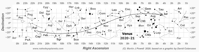 The path of Venus through the zodiac constellations during the planet's morning apparition in 2020-21 (move your cursor over the image - or click on it - to reveal the constellation names in their abbreviated three-letter form - the full names are listed here). Tick-marks indicate the first day of each month. Zodiac constellations are labelled in green and non-zodiac constellations in grey. The numbers along the sides of the chart (Right Ascension and Declination) are co-ordinates of celestial longitude and latitude which are used to locate the position of celestial bodies in the night sky. A print-friendly version is available here. |