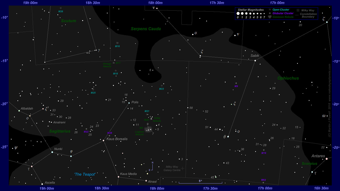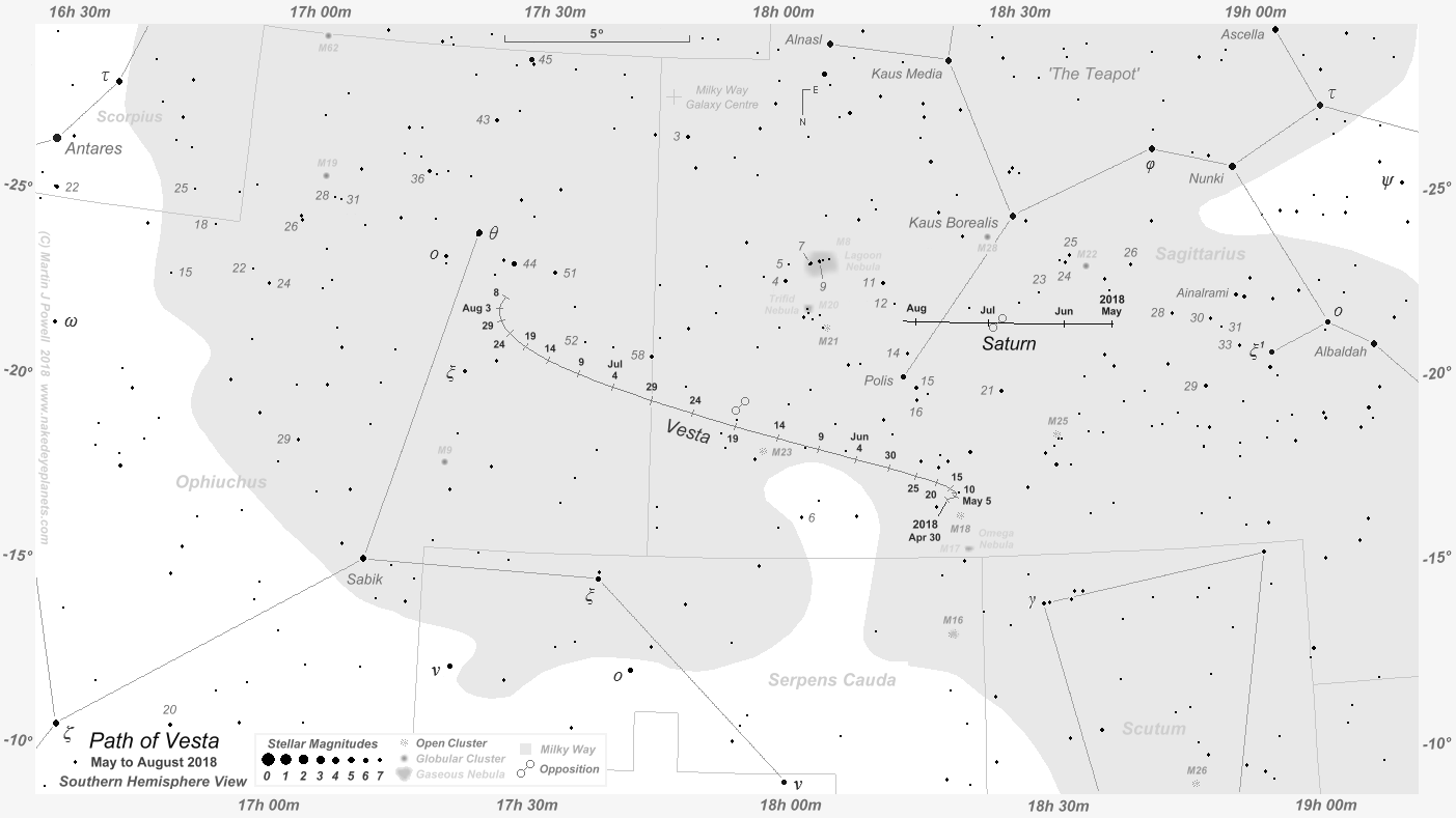 Finder Chart showing the position of asteroid 4 Vesta at 5-day intervals from May through to early August 2018 (click on the thumbnail for the full-size image). This is the period during which the asteroid was technically visible to the naked-eye (i.e. brighter than apparent magnitude +6.5). Saturn was also in the vicinity and its path is shown over the same period (marked on the 1st day of each month). A Southern hemisphere view of the chart can be found here and a printer-friendly (greyscale) version can be obtained for Northern and Southern hemisphere views. Vesta moved through