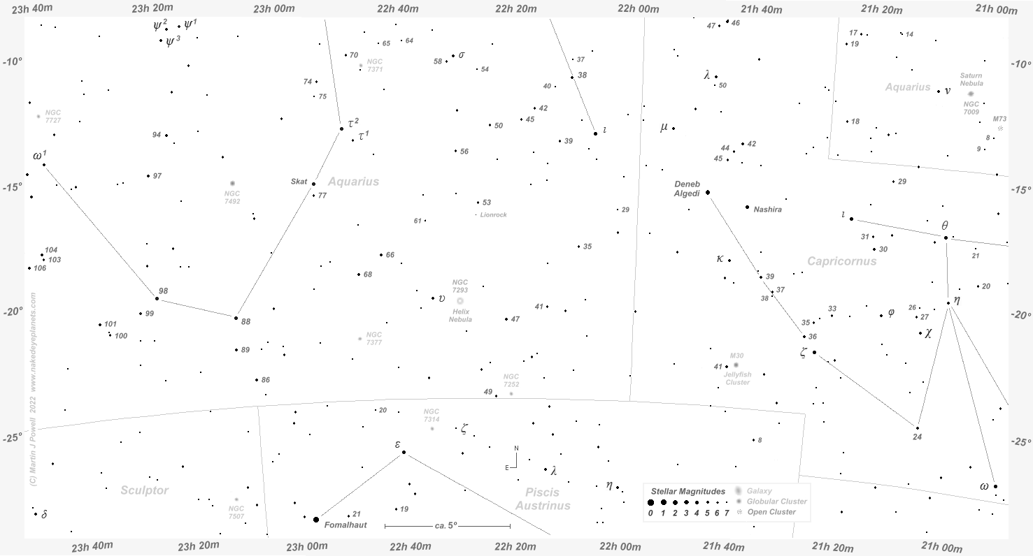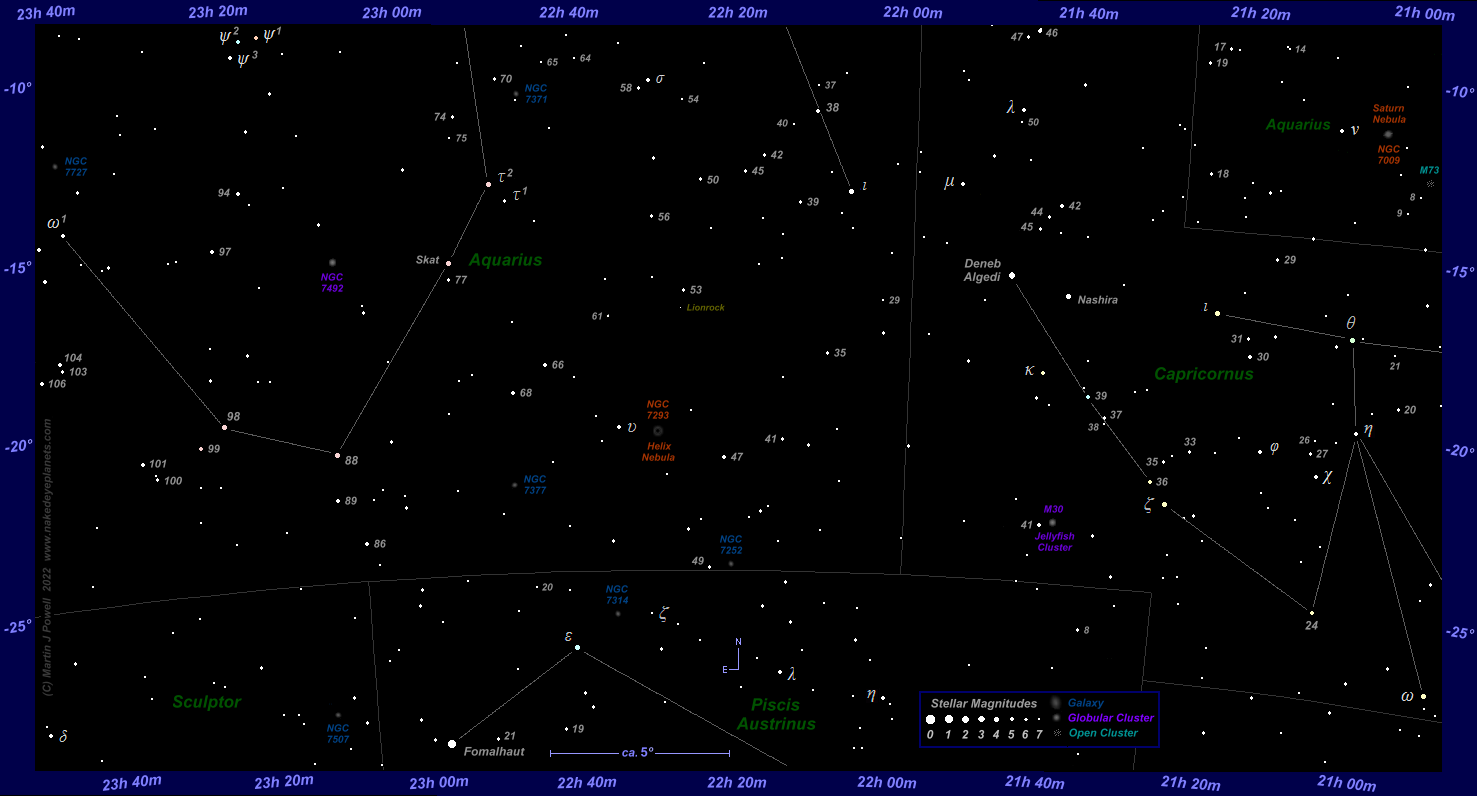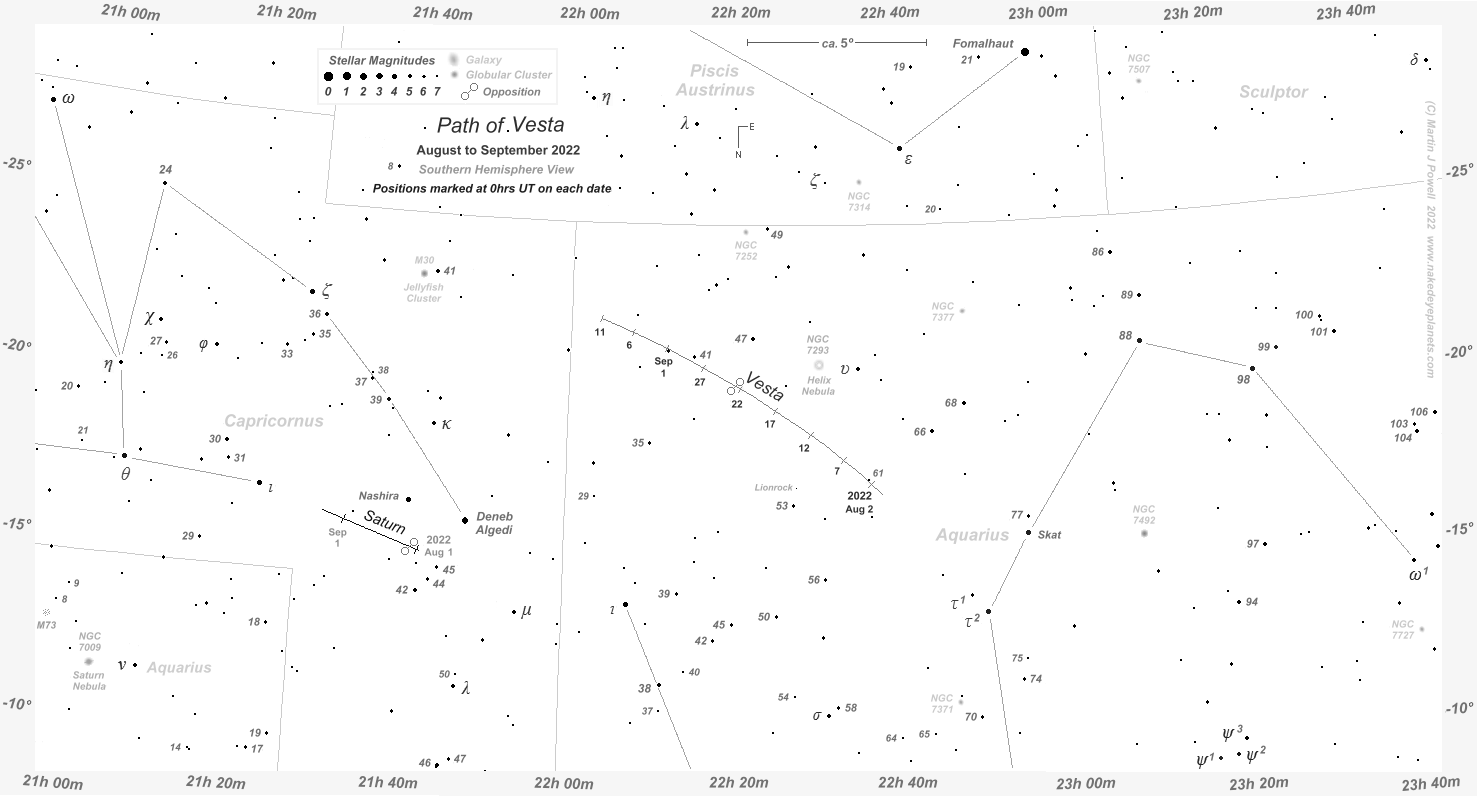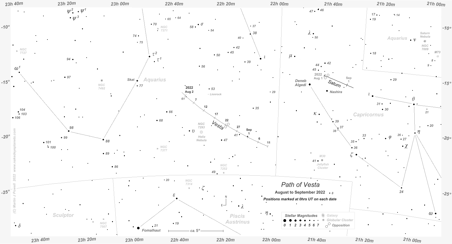 Finder Chart showing the path of asteroid 4 Vesta through southern Aquarius at 5-day intervals from late July to mid-September 2022 (click on the thumbnail for the full-size chart). This is the period during which the asteroid was technically visible to the naked-eye (i.e. brighter than apparent magnitude +6.5) from fully dark, non light-polluted skies. A Southern hemisphere view of the chart can be found here and a printer-friendly (greyscale) version can be obtained for Northern and Southern hemisphere views. The path of Saturn, positioned close by in Capricornus, is also shown over the same period. Vesta reached opposition to the Sun (its closest point to the Earth, when it shone at its brightest for the year) on August 22nd 2022, when it was 1.2853 Astronomical Units (192.3 million kms or 119.5 million miles) from the Earth. Vesta then shone at magnitude +6.1. Click here to see a 'clean' star map of the area (i.e. without asteroid path); a printable version can be found here. The faintest stars shown on the chart have a magnitude of about +7.6. Astronomical co-ordinates of Right Ascension (longitude, measured Eastwards in hrs:mins) and Declination (latitude, measured in degrees North or South of the celestial equator) are marked around the border of the chart. |