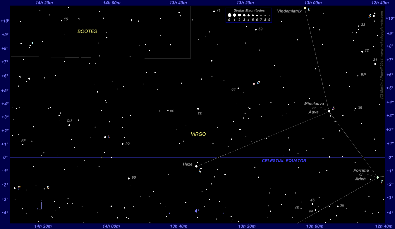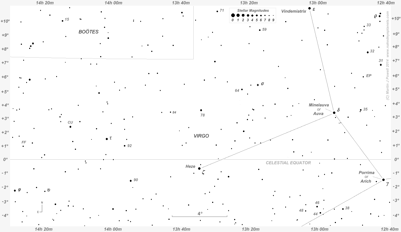 Northern hemisphere observers can easily find Virgo from The Big Dipper (Plough) asterism using the method shown here. The planet Mars was also shining brightly in Southern Virgo during the period; its path in the night sky is shown on the Mars 2013-15 page.