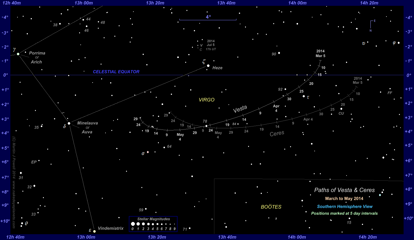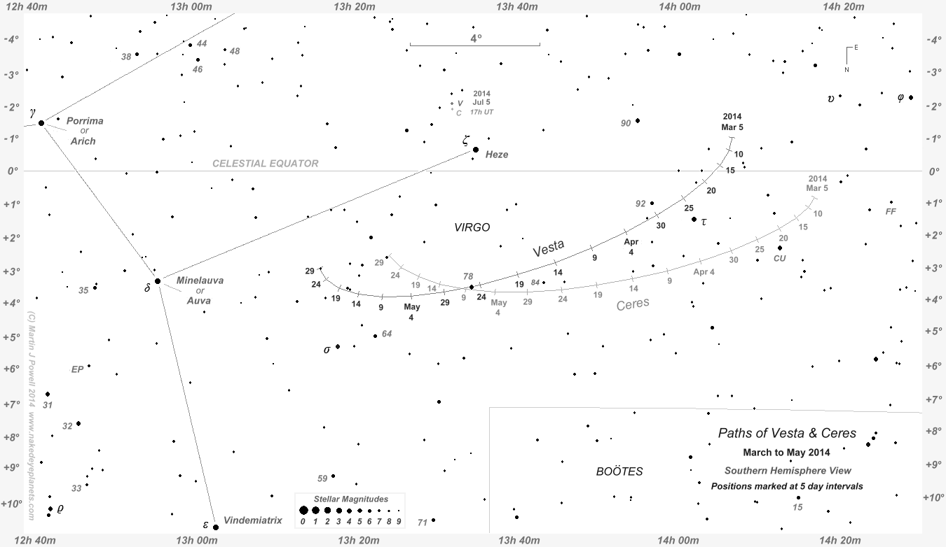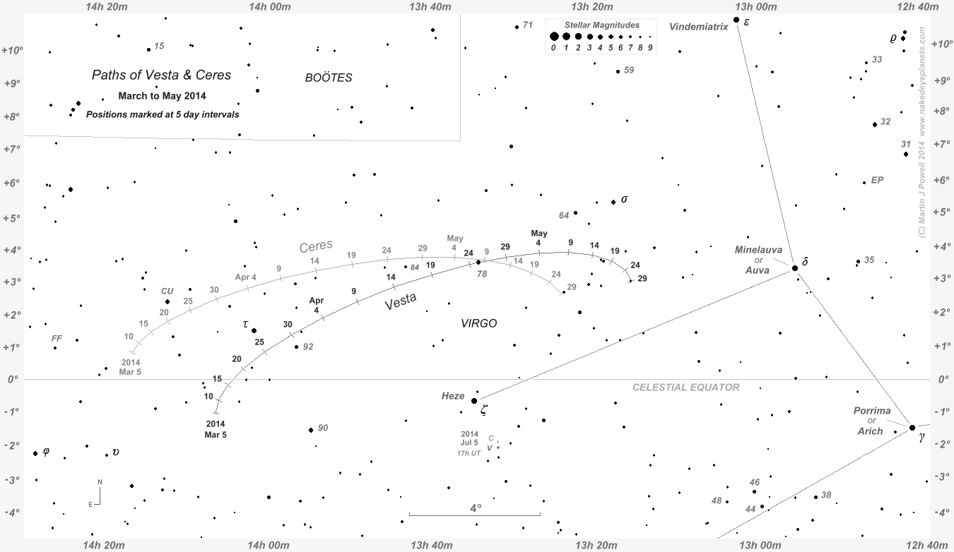 Ceres (pronounced 'SEER-ees') is included on the chart because it was coincidentally near Vesta in the night sky during this time (although it was below naked-eye magnitude throughout the period, reaching +7.0 at opposition on April 15th 2014). In fact, between early April and late July 2014 Vesta and Ceres were separated by less than 2° in the night sky.
